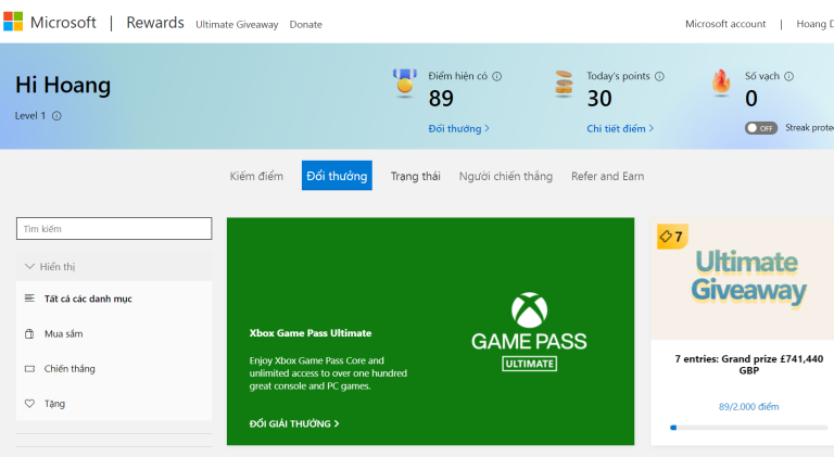 Sau đấy là giao diện tài khoản Microsoft để bạn có thể bắt đầu kiếm điểm Rewards: